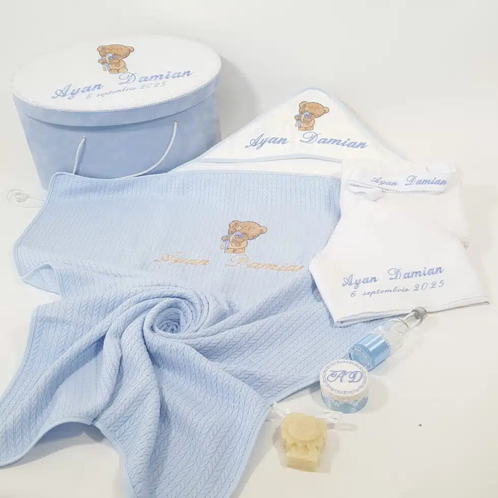 Trusou pentru botez baietel cu ursuleti si cufar catifea bleu